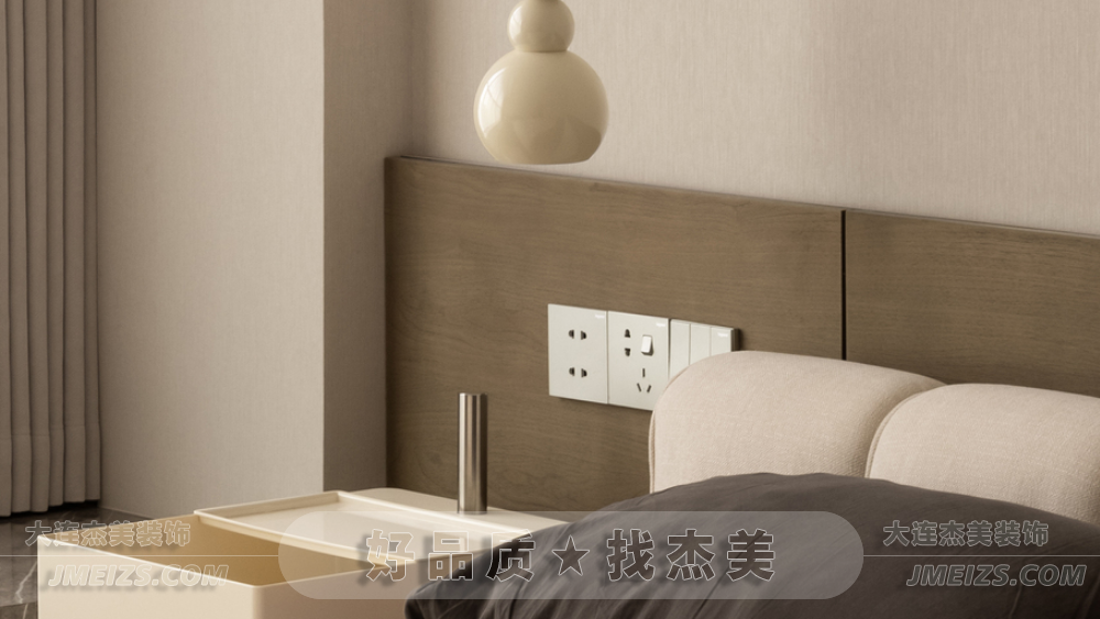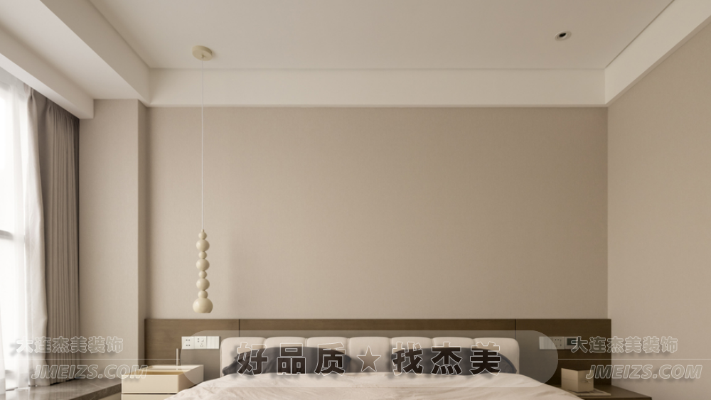 主臥室溫馨純凈,以奶茶色和淡雅白色為基調(diào),營(yíng)造簡(jiǎn)約色系的寧?kù)o治愈感。床頭背后采用原木飾面板,展現(xiàn)現(xiàn)代主義下的自然美學(xué)。