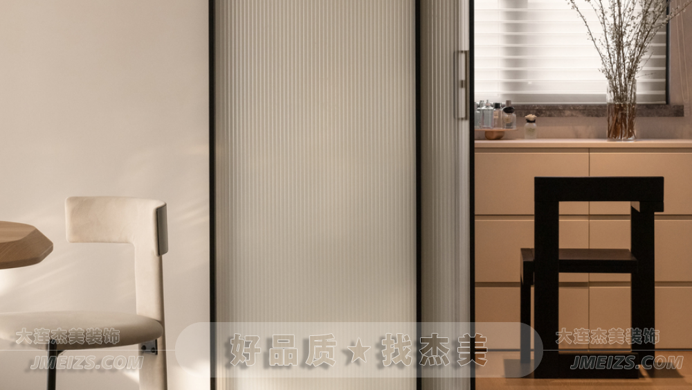 在廚房一側(cè),杰美裝飾設(shè)計(jì)師設(shè)計(jì)了一個(gè)小型步入式衣帽間,外側(cè)采用長(zhǎng)虹玻璃幽靈門(mén),確??臻g寬敞通透。內(nèi)部的兩側(cè)墻面用作衣柜,中間臨窗區(qū)域的抽屜柜兼具梳妝臺(tái)功能,百葉簾引入朗朗的日光,讓空間流露出時(shí)尚現(xiàn)代的感覺(jué)。
