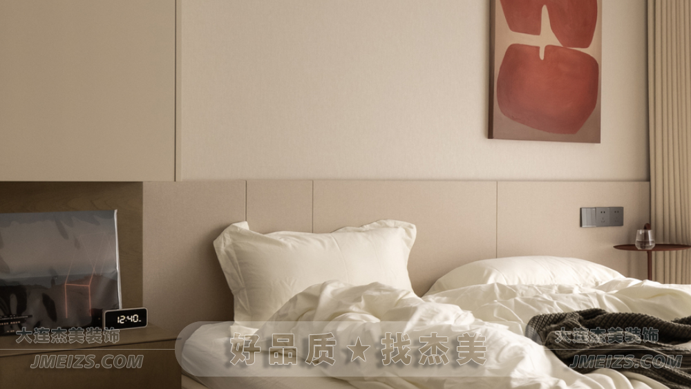 次臥采用無(wú)床頭設(shè)計(jì),用硬包代替床頭靠背,背景墻搭配一幅藝術(shù)肌理畫(huà),深色調(diào)為空間增加視覺(jué)重點(diǎn)。柜體采用懸浮式設(shè)計(jì),與不同色彩組合,打造出和諧的美學(xué)秩序,為家居增色的同時(shí)提升了生活的儀式感。